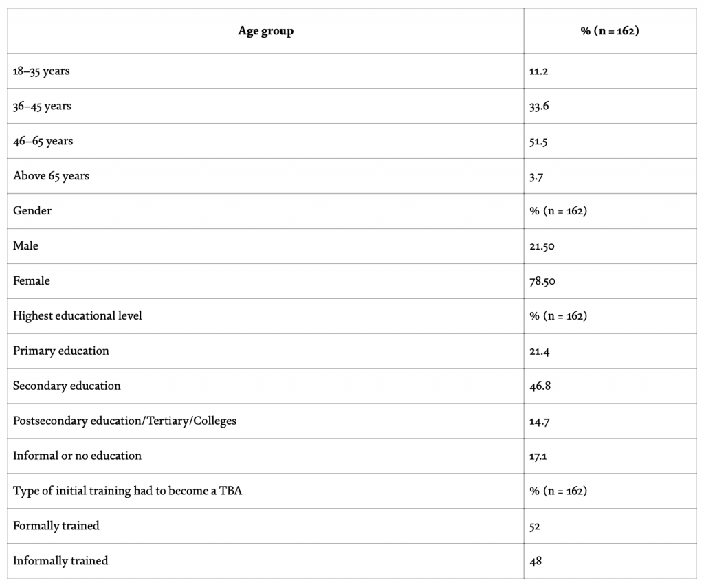 Some evidence supporting this from data collated through our TTT project showed that of the 162 reached and trained; 51.5% were between the ages of 46–65, 33.6% between 36 and 45 years, rarely the elderly who trained them showed (they made up only 3.7%) and the young one who is currently receiving the informal training (18–35 years’ participant made up just 11.2%). Keep in mind that age should not be a limitation to acquiring knowledge. Likewise, primarily those who had some form of formal training wanted more, as 52.0% of participants had some formal training to become birth attendants or community healthcare providers versus 48.0% who were informally trained. While 21.4% had primary education, 46.8% had secondary education, 14.7% had postsecondary education (including college of health technology), and 17.1% had informal or no education.