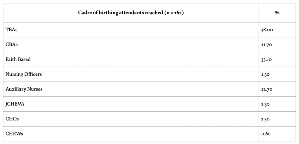 Furthermore, the percentage of all participants attending the training by qualification and initial training was recorded; 38.0% were TBAs, 33.1% were faith-based birth attendants, 12.7% Auxiliary nurses, 11.7% CBAs, 1.3% Nursing Officers, 1.3% CHOs, 1.3% JCHEWs and 0.6% CHEW (SHI 2020 Annual report) [24]. This lower attendance of CBAs with higher qualifications might be attributed to the perceived need or aim for more training, mode of community entry, reachable circle, and target of CBAs mobilizer.
